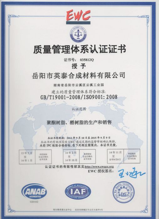 岳阳市英泰合成材料有限公司通过ISO9001和ISO14001