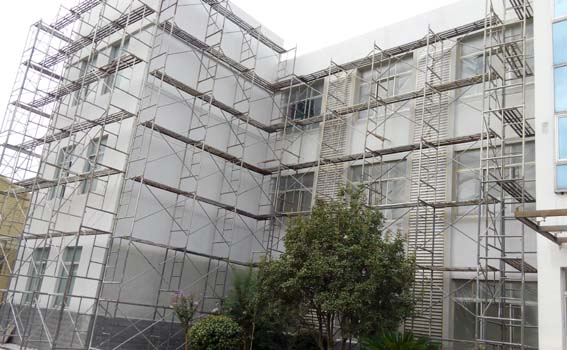 目前,办公楼外墙装修工作已经过半,已完成的部分焕然一新,室内装修工作也在有条不紊地进行中。